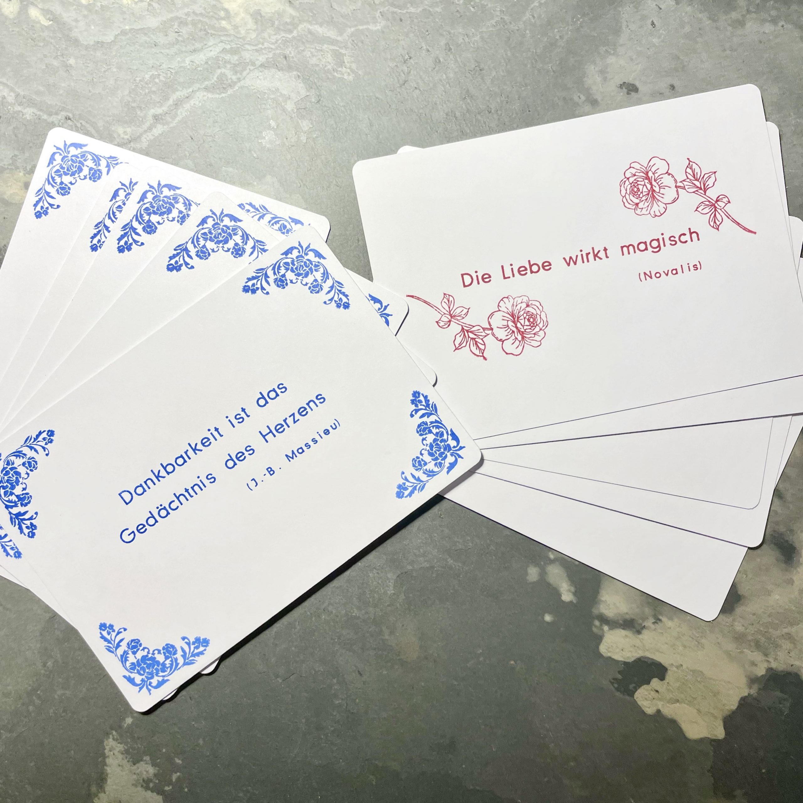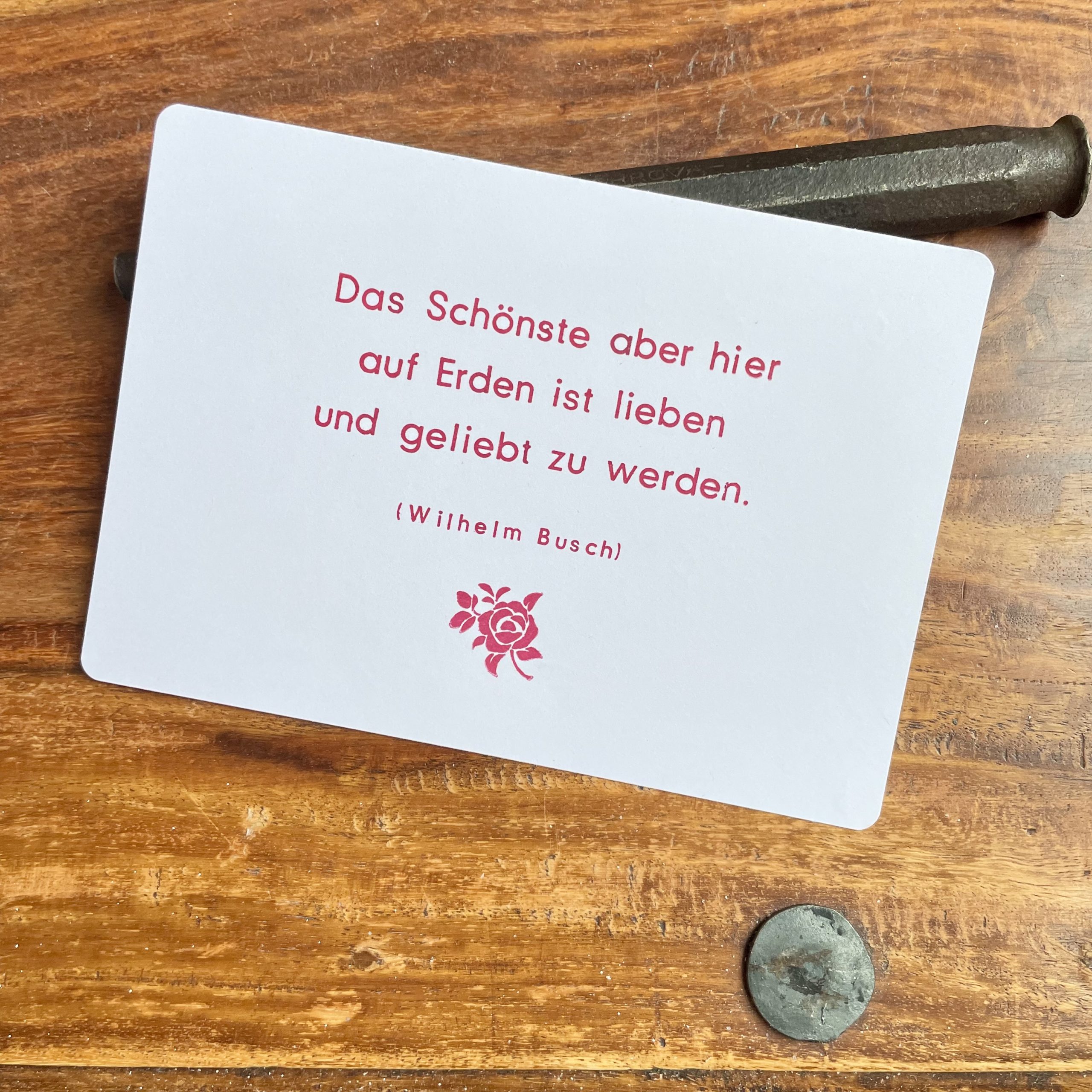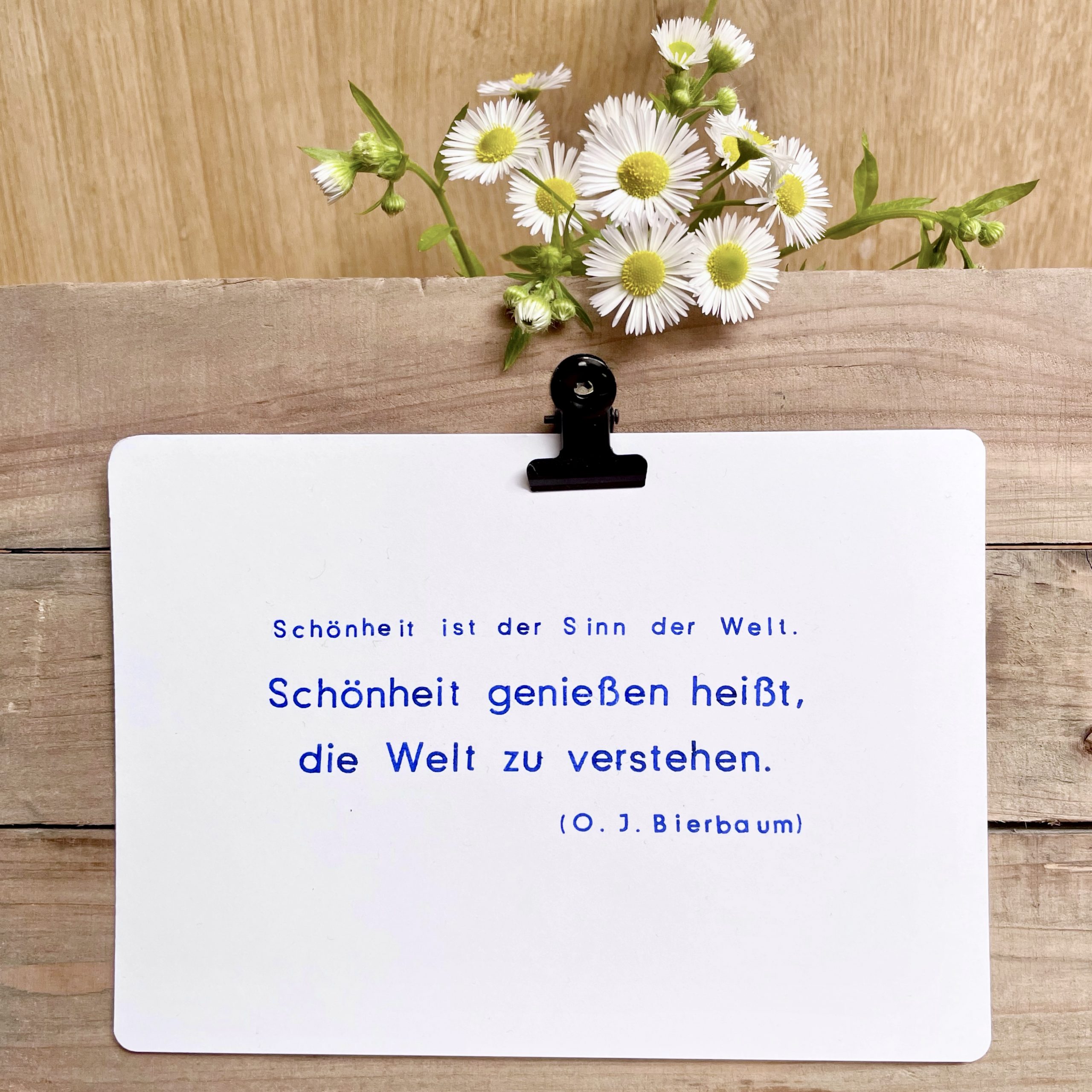 Die Postkarten stempele ich per Hand mit Buchstabensetzkasten (einzelne bewegliche Lettern wie im traditionellen Buchdruck/Gutenberg). Die Zitate sind gemeinfrei. Verziert mit Echtleder.