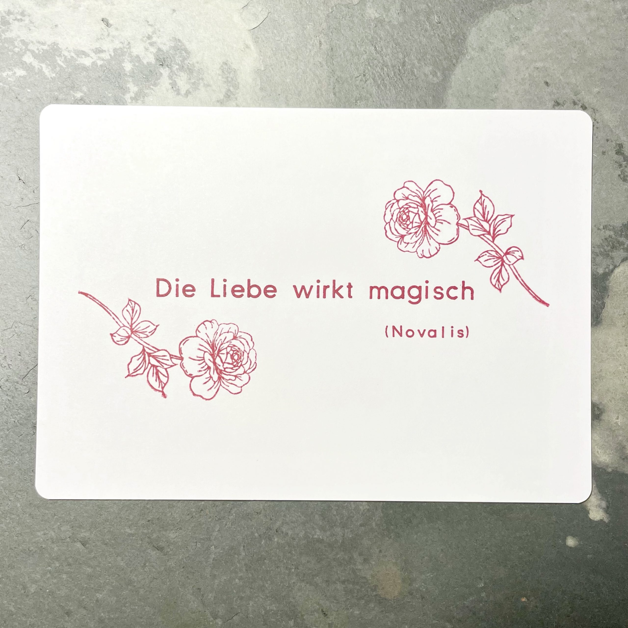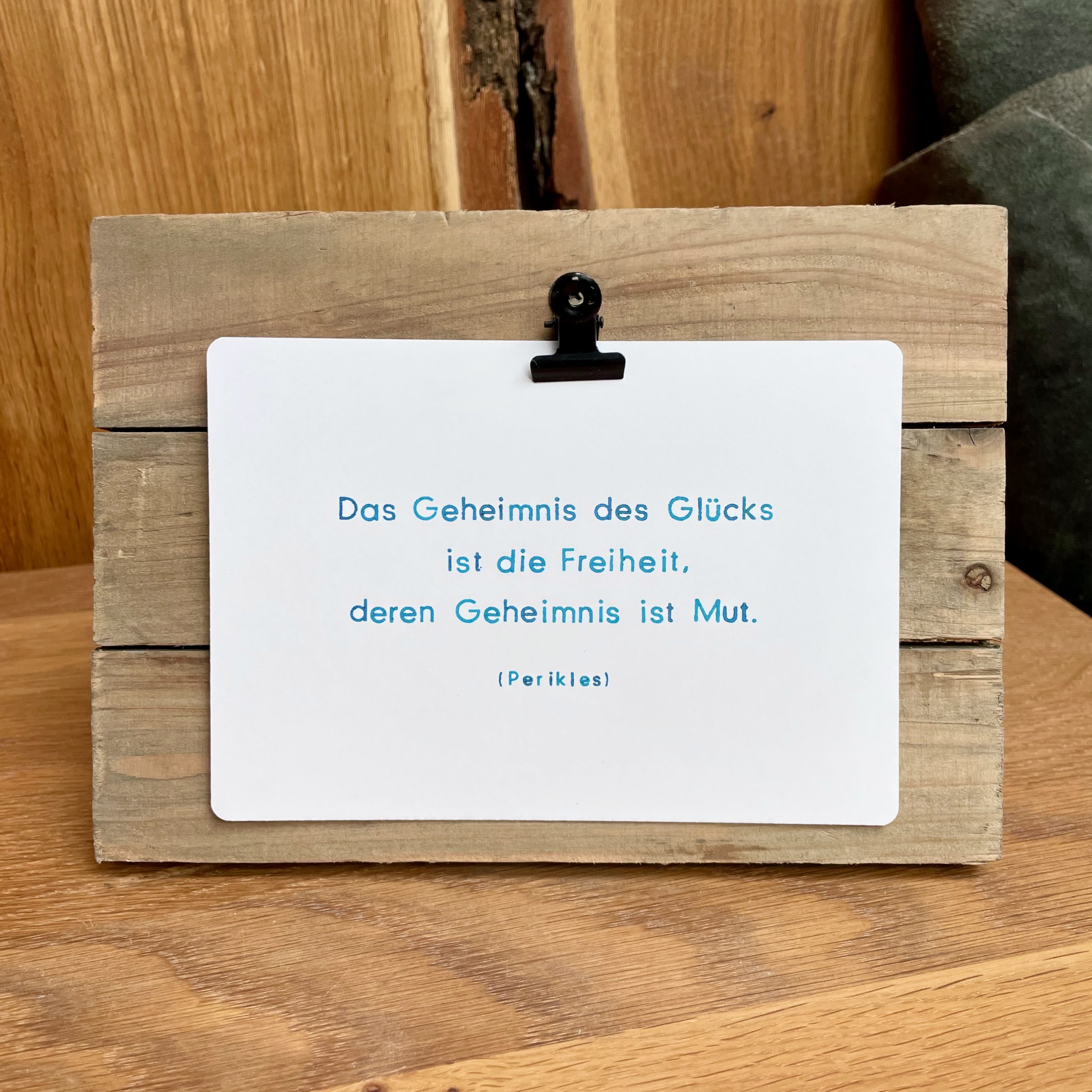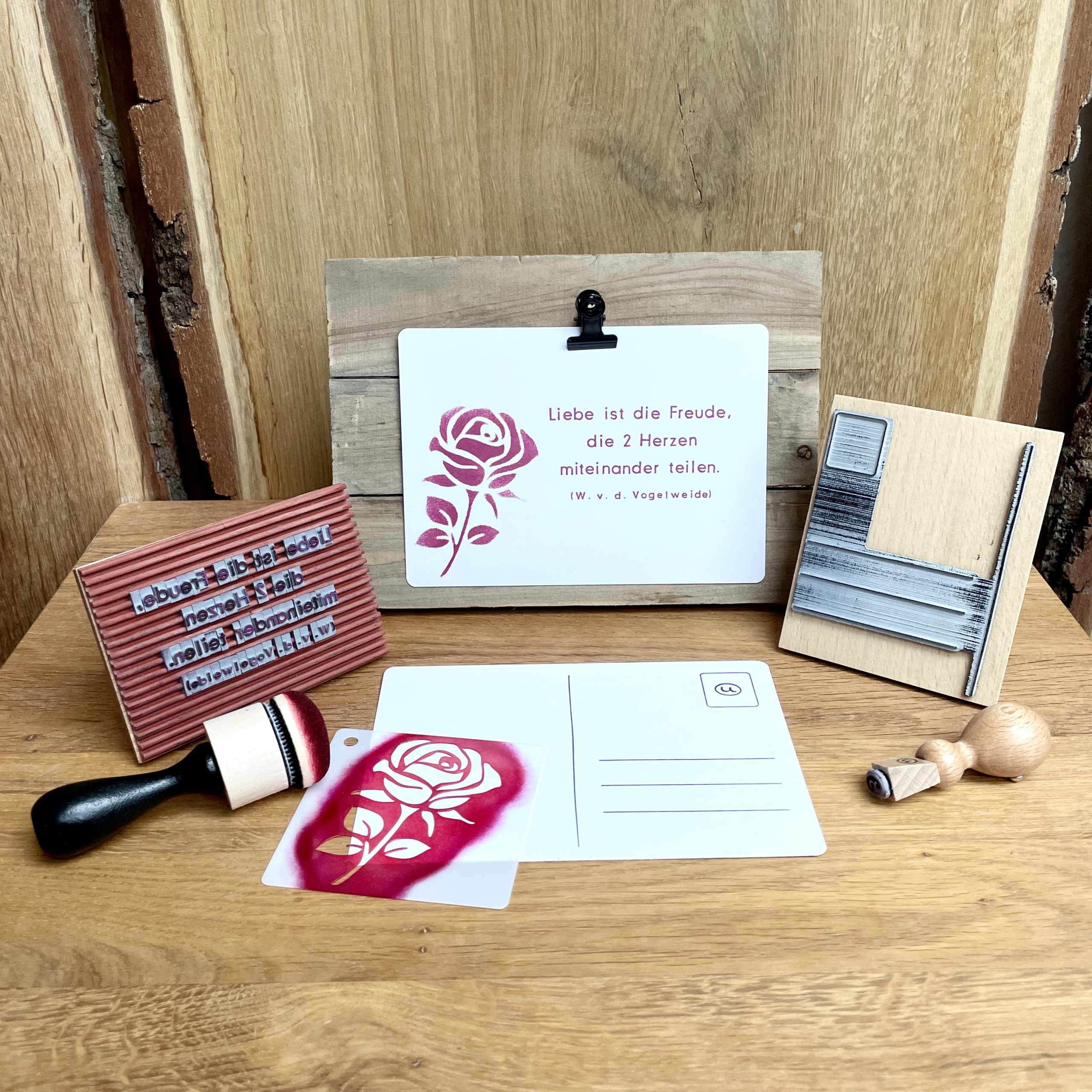 Die Postkarten stempele ich per Hand mit Buchstabensetzkasten (einzelne bewegliche Lettern wie im traditionellen Buchdruck/Gutenberg). Die Zitate sind gemeinfrei. Verziert mit Echtleder.