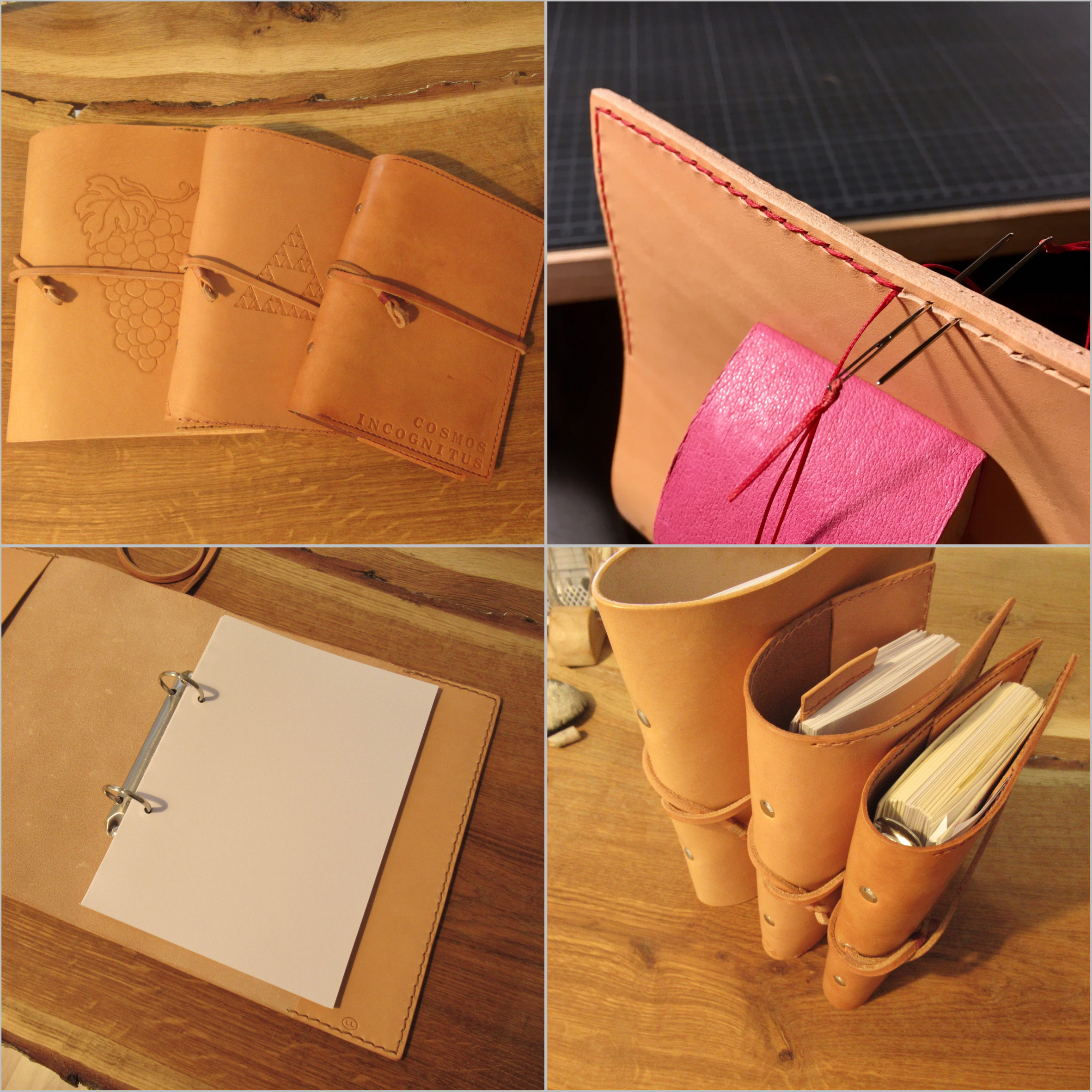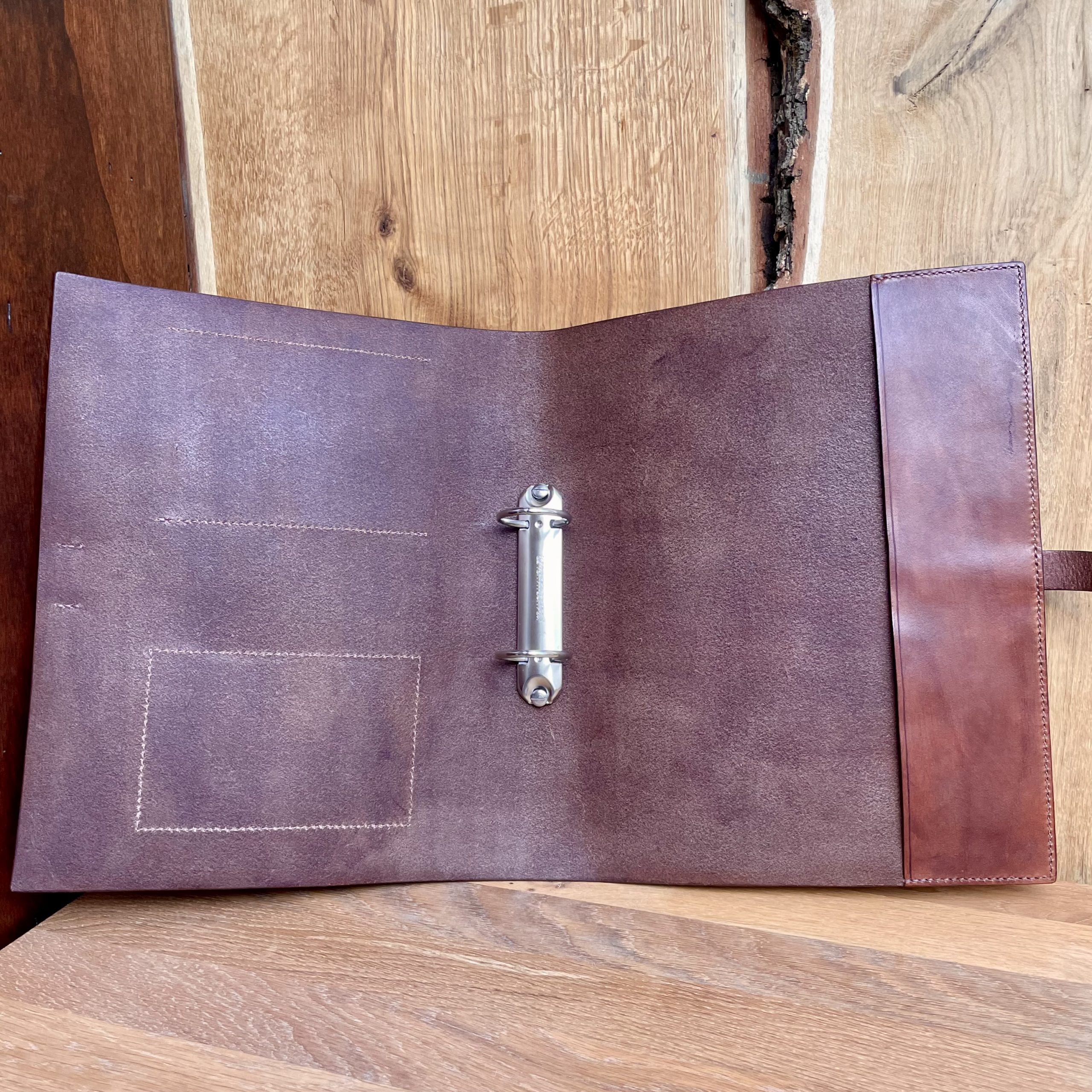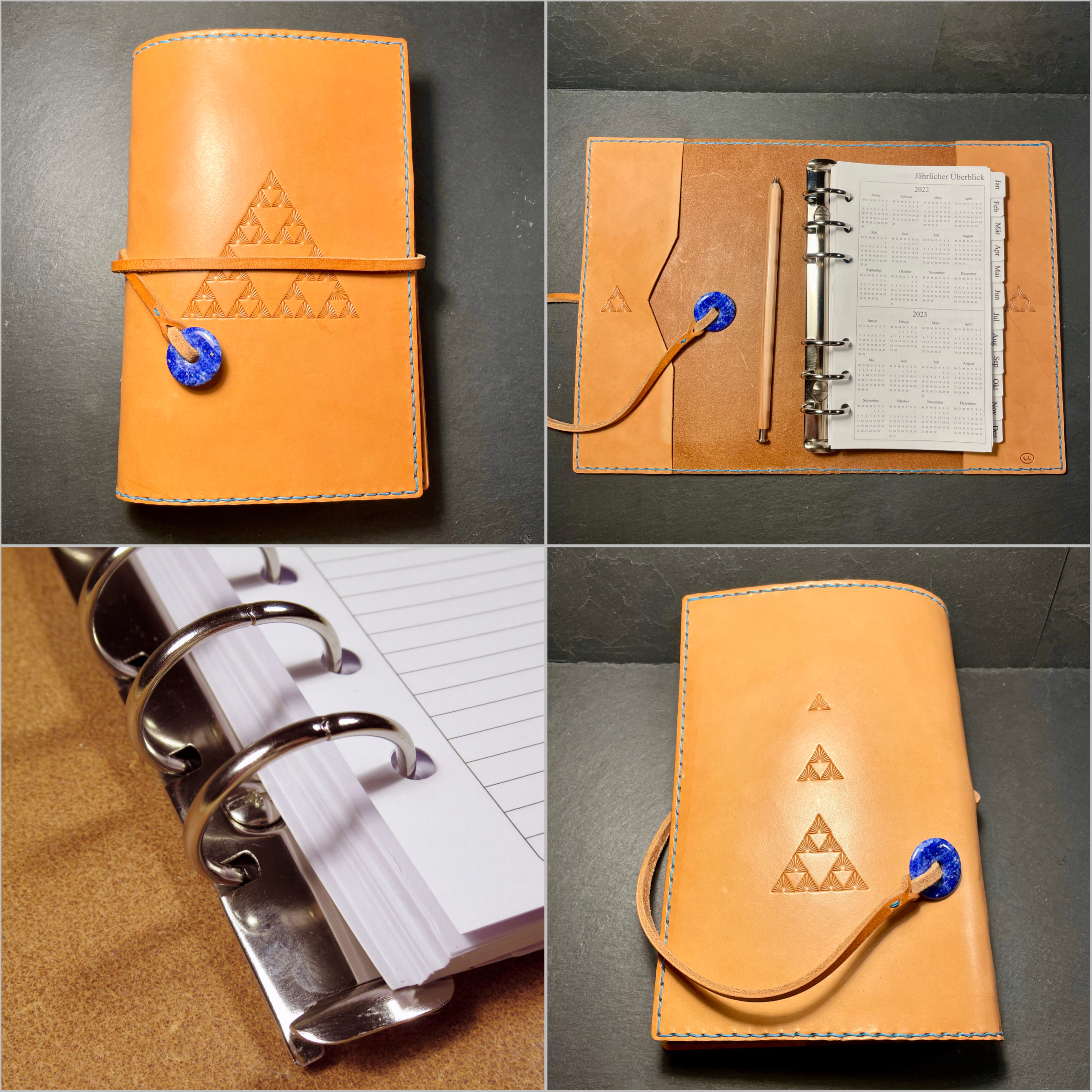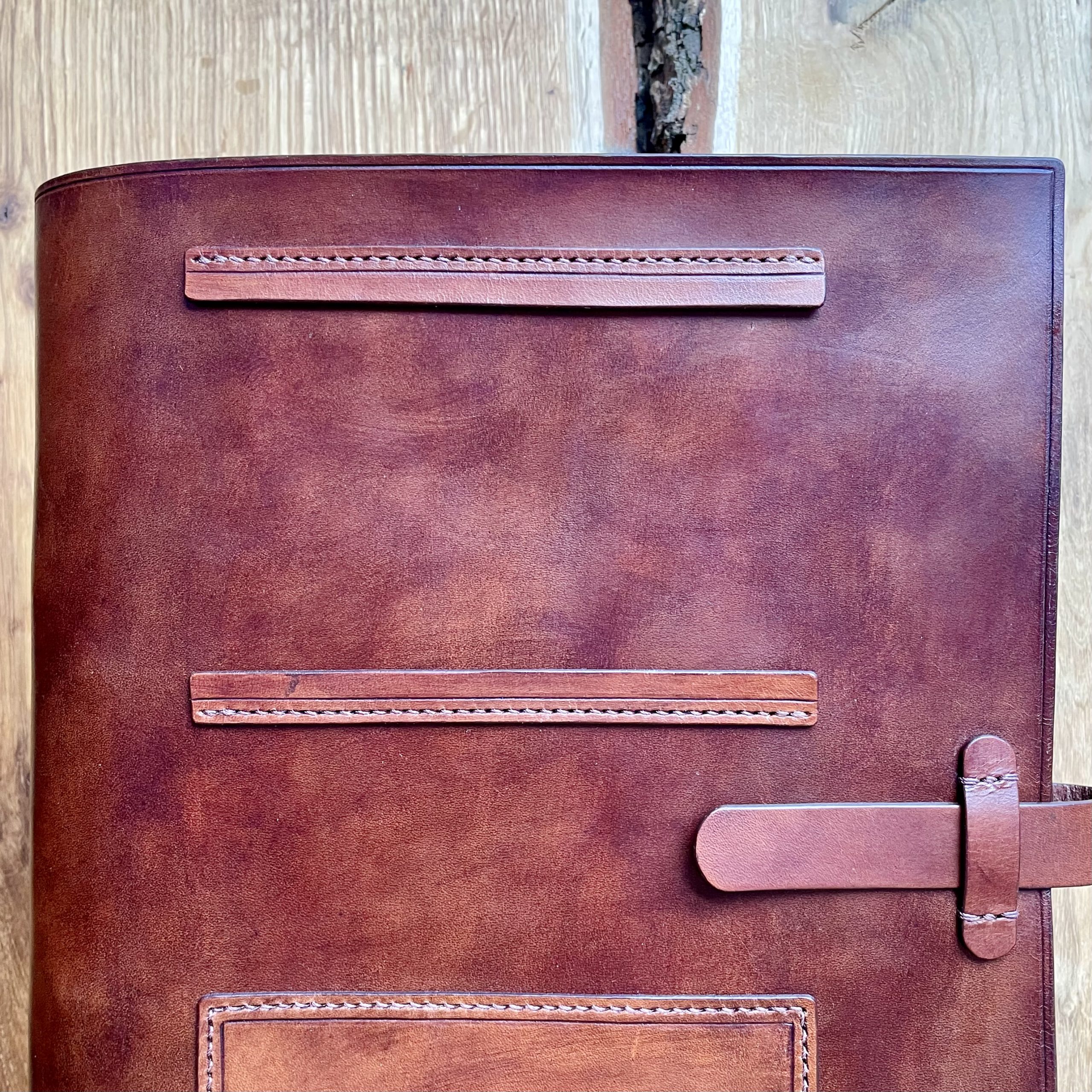 Handgenähte Mappen aus pflanzlich gegerbtem Rindleder für Ringbucheinlagen (Kalender oder Blankoblätter) bis DIN A4 Größe, mit 2-fach oder 6-fach Lochung.