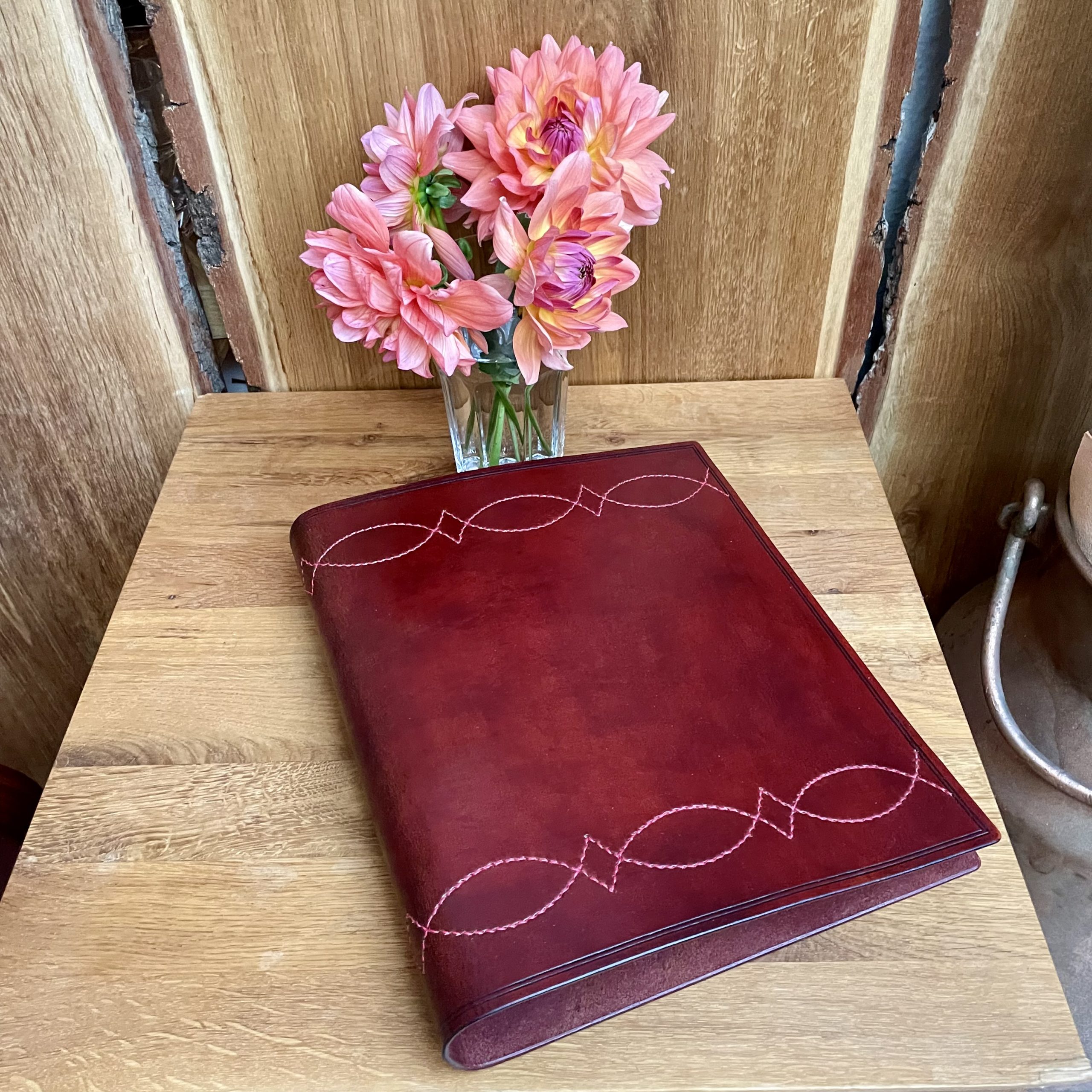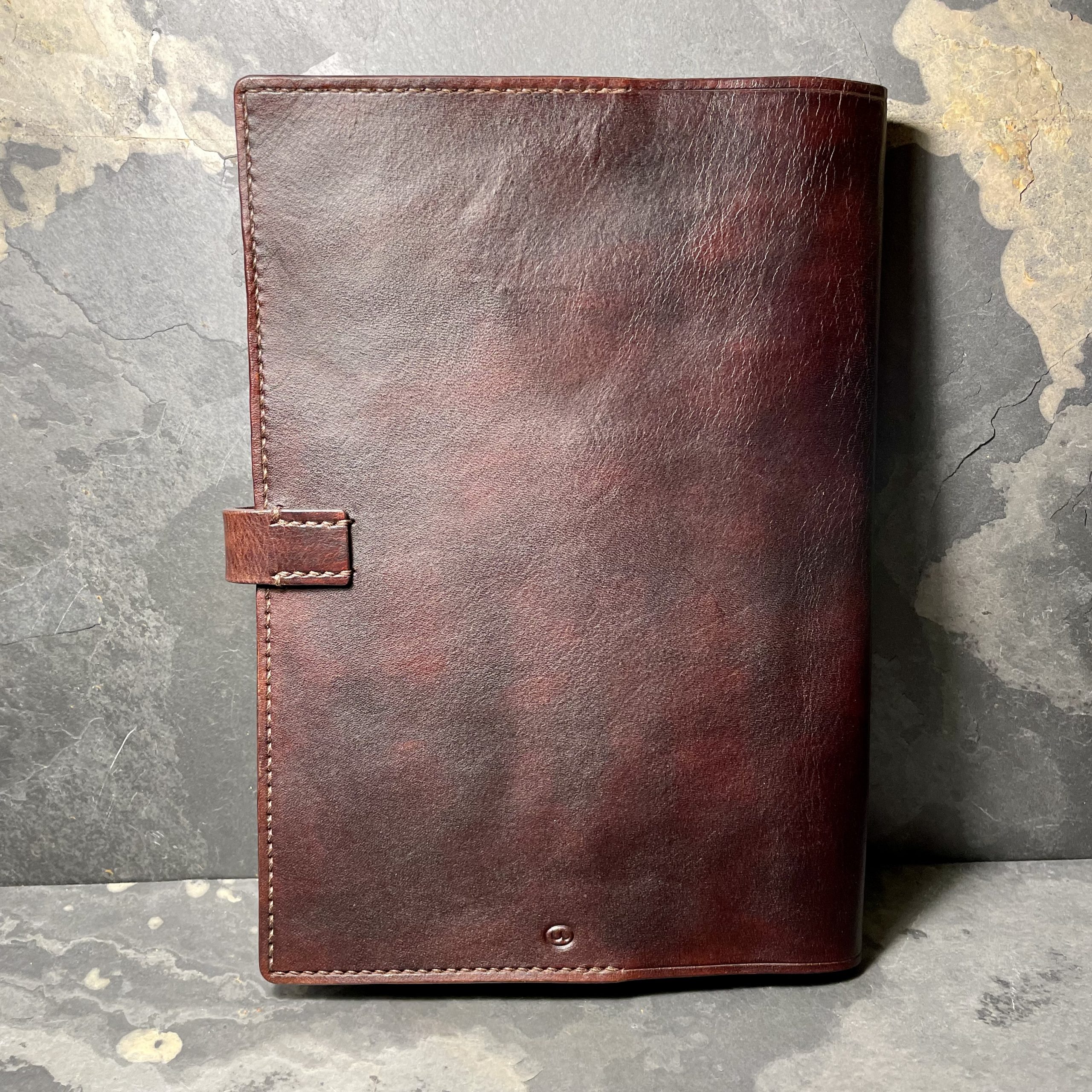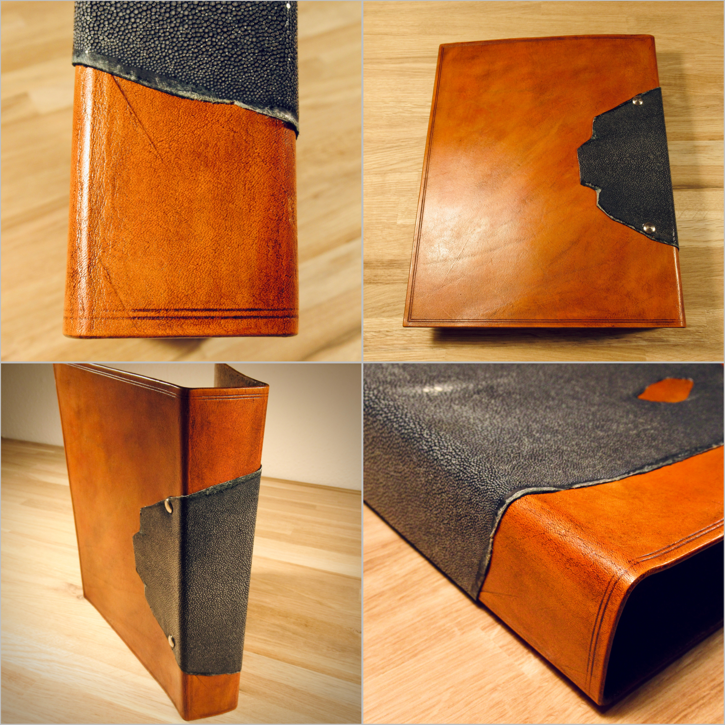 Handgenähte Mappen aus pflanzlich gegerbtem Rindleder für Ringbucheinlagen (Kalender oder Blankoblätter) bis DIN A4 Größe, mit 2-fach oder 6-fach Lochung.