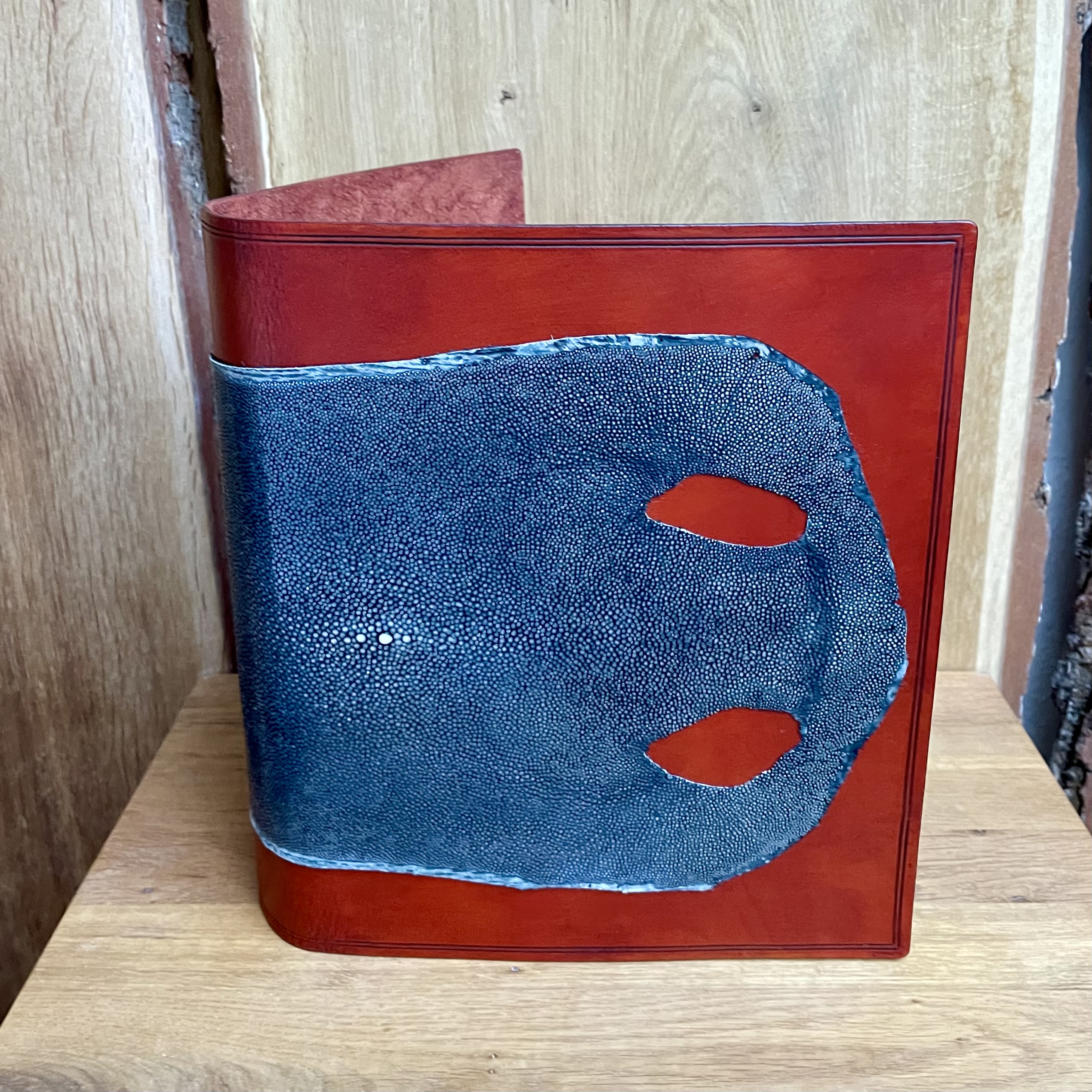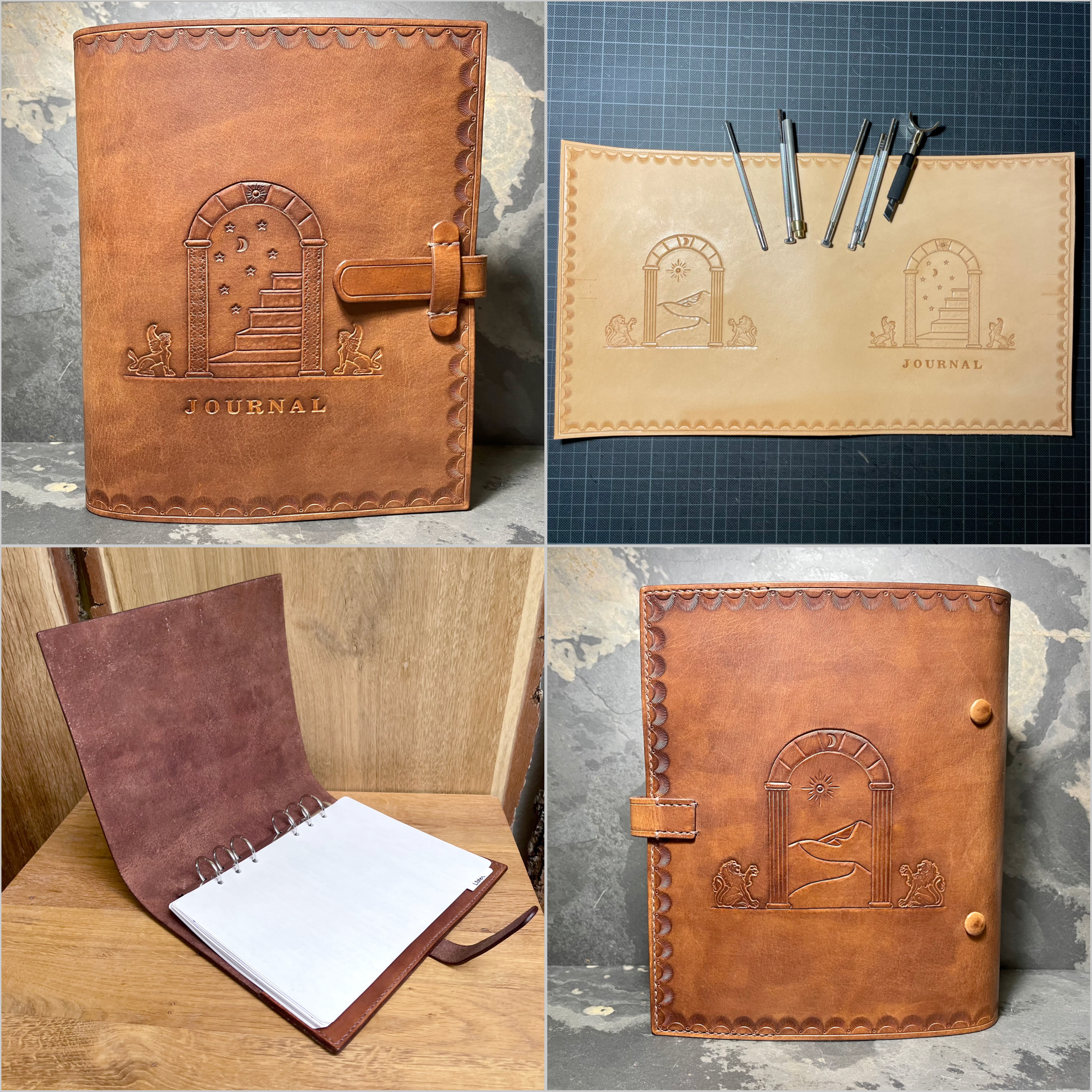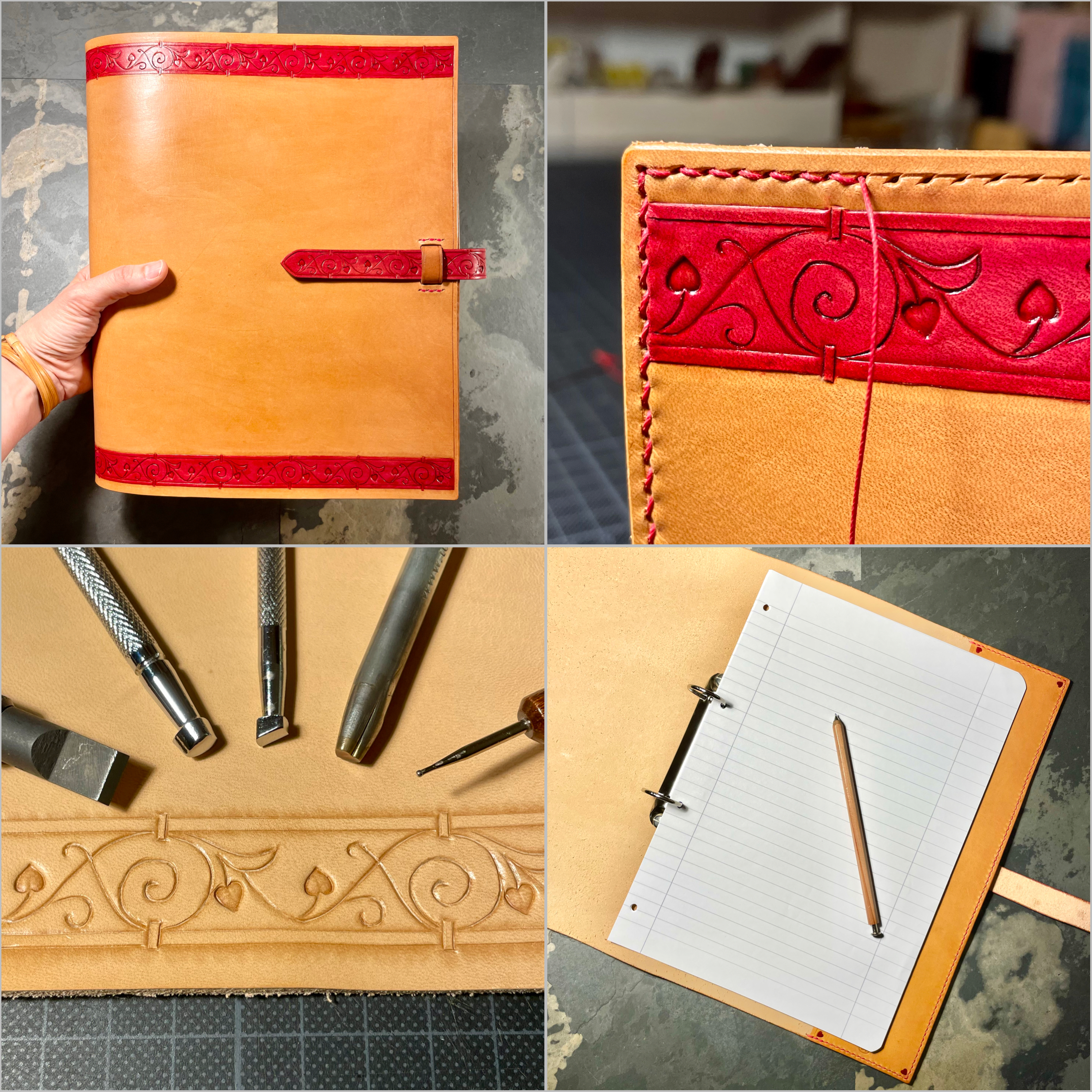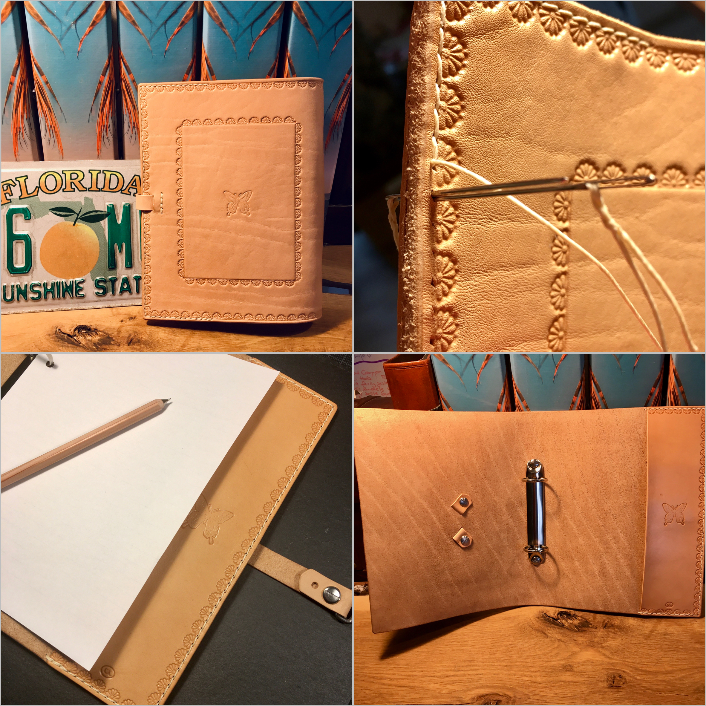 Handgenähte Mappen aus pflanzlich gegerbtem Rindleder für Ringbucheinlagen (Kalender oder Blankoblätter) bis DIN A4 Größe, mit 2-fach oder 6-fach Lochung.