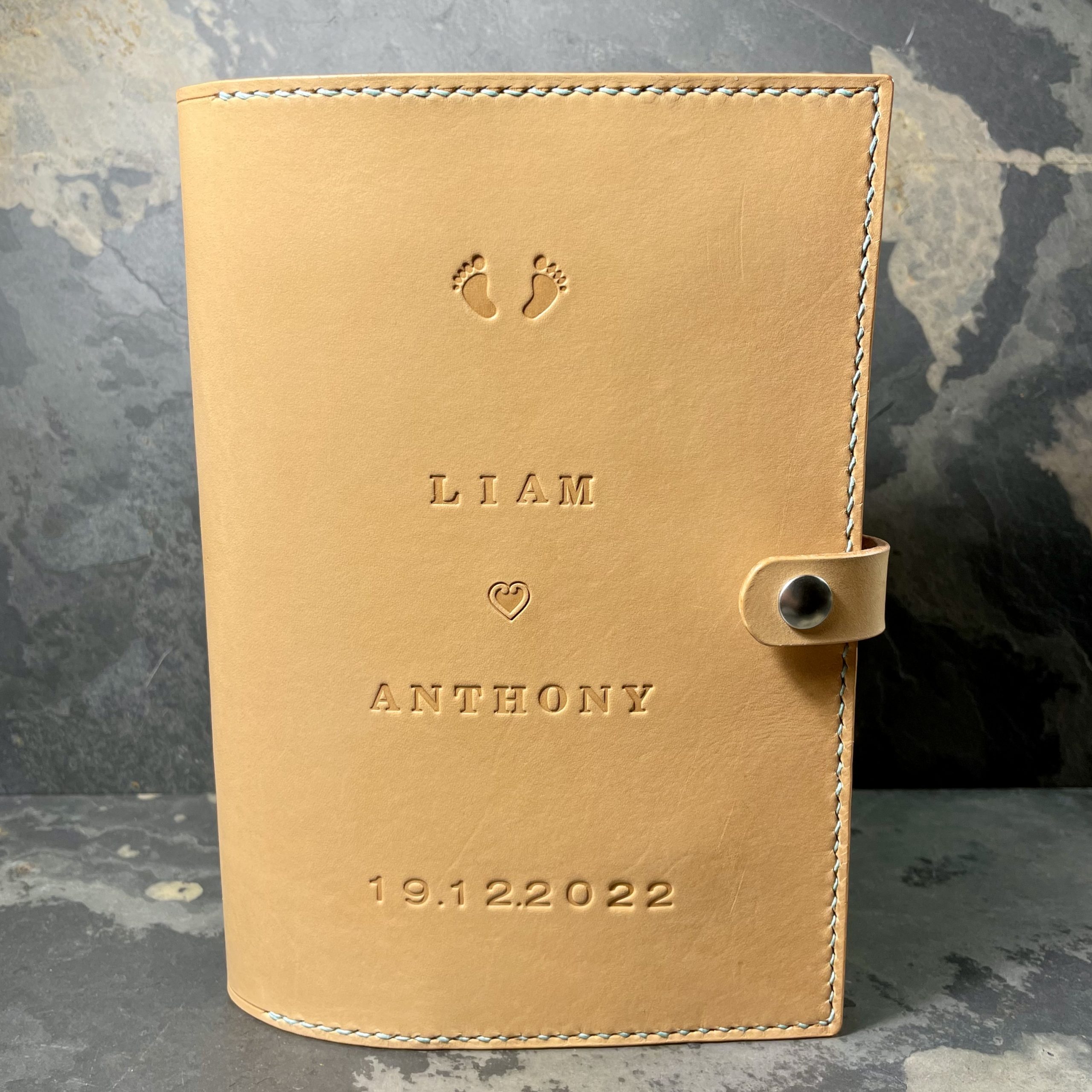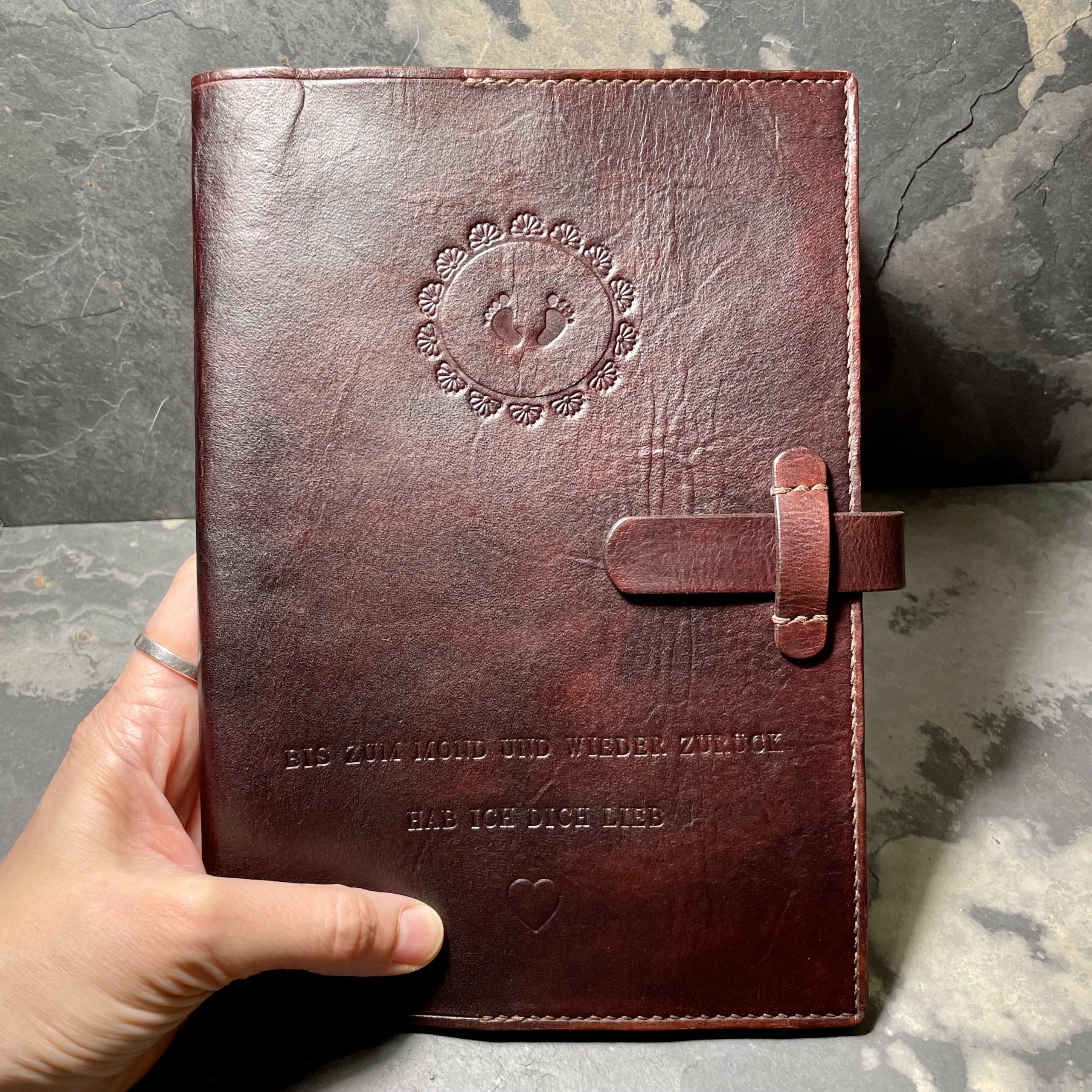 Gewicht und Größe des Babys sind auf den Innenseiten der Sternenmappe aus pflanzlich gegerbtem Rindleder festgehalten.