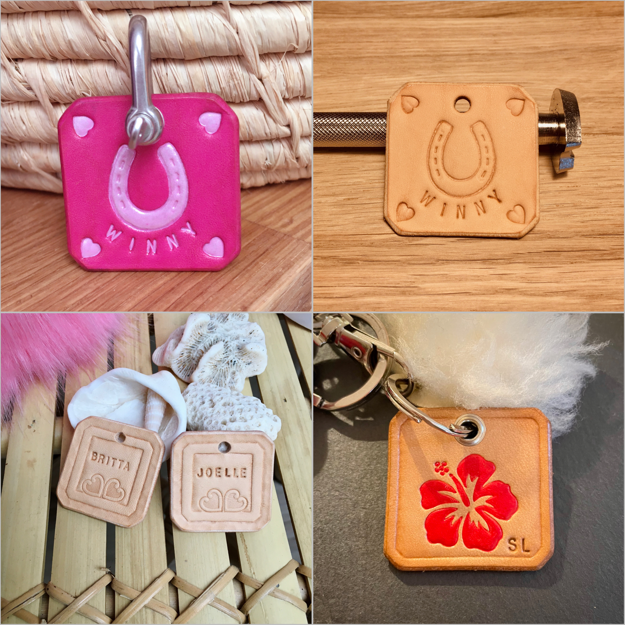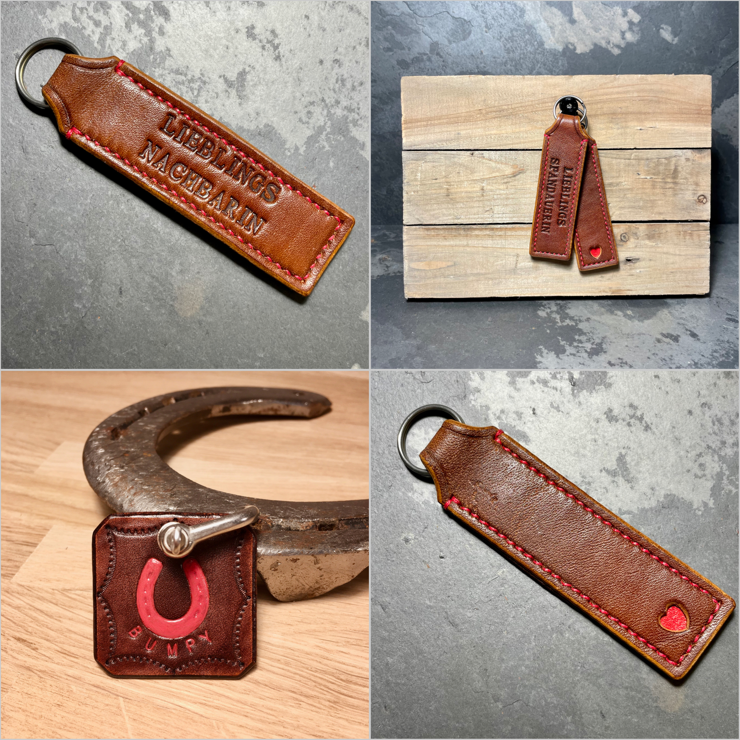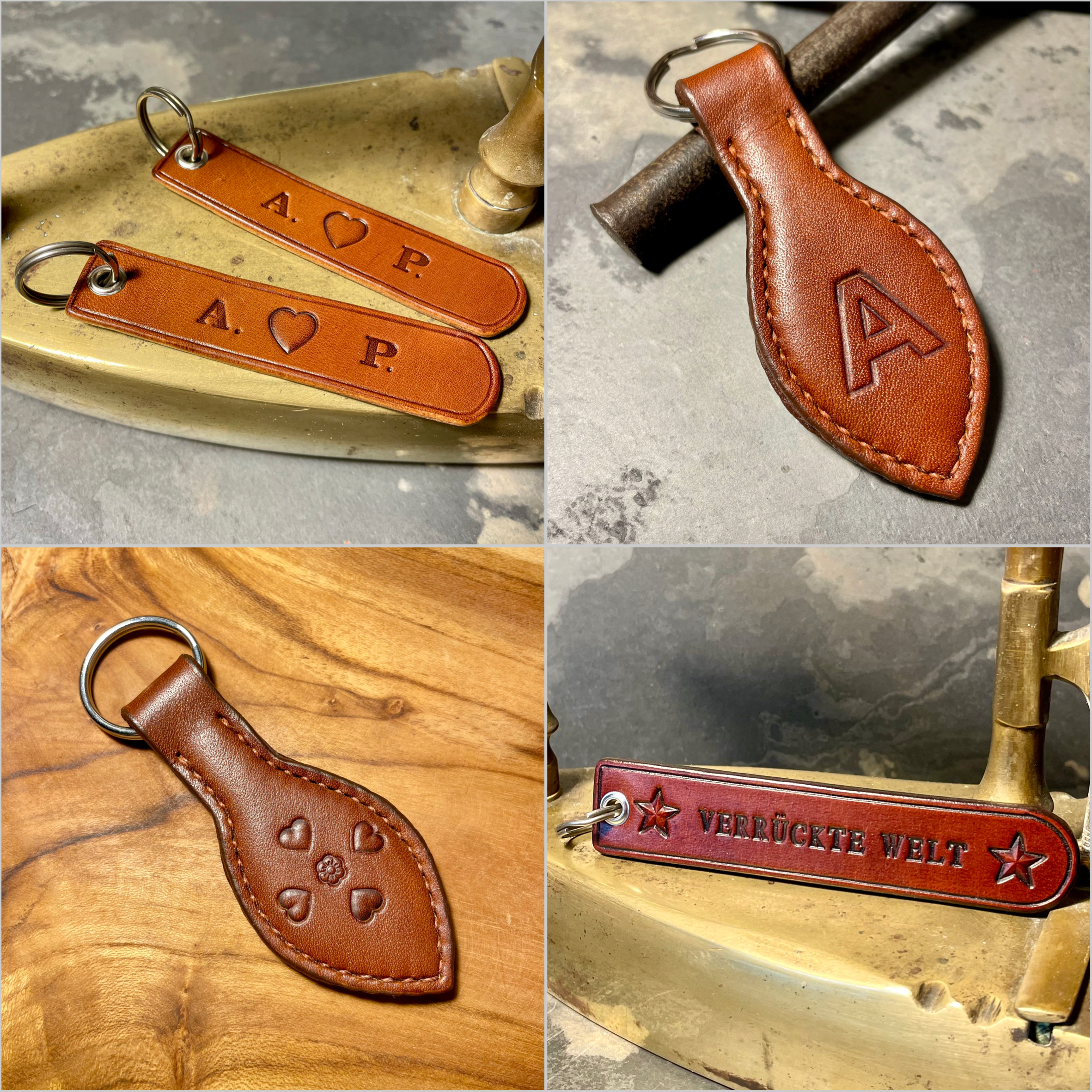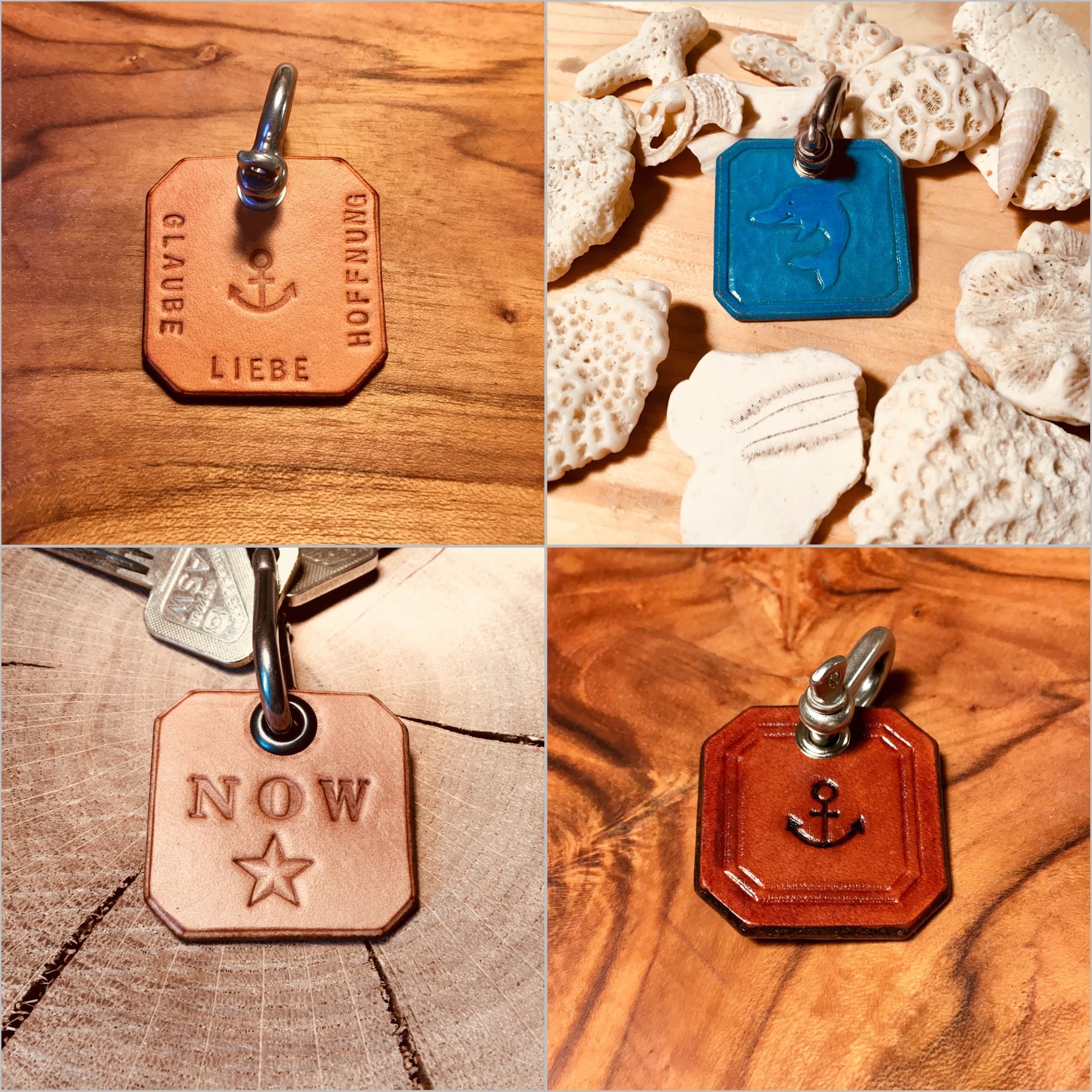 personalisierte Motive • vegetabil gegerbtes Rindleder •handgeflochten (8-strängig) aus Büffelleder • Beschläge aus Edelstahl, Messing oder 925 Silber • handgefärbt und handgenäht mit Leinengarn