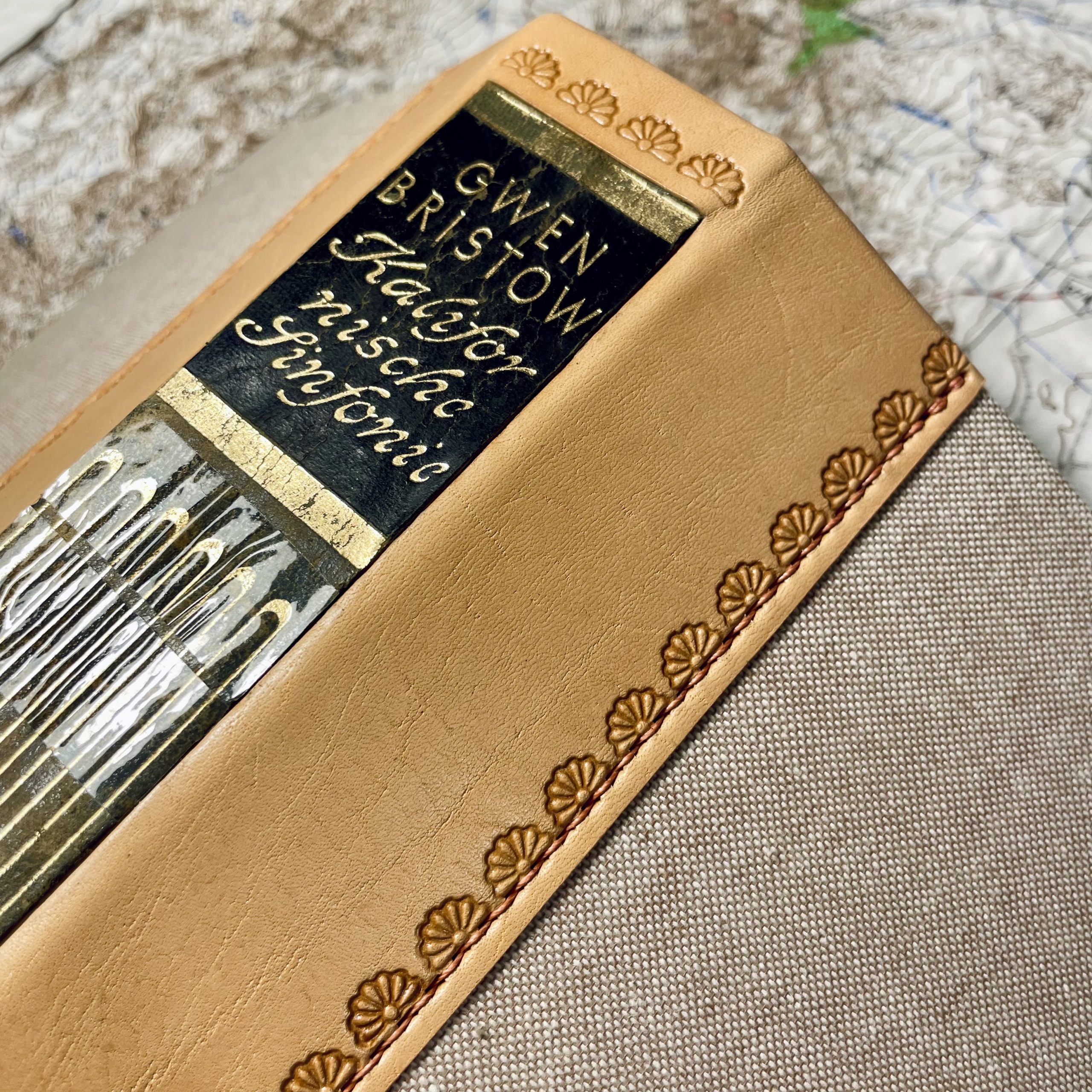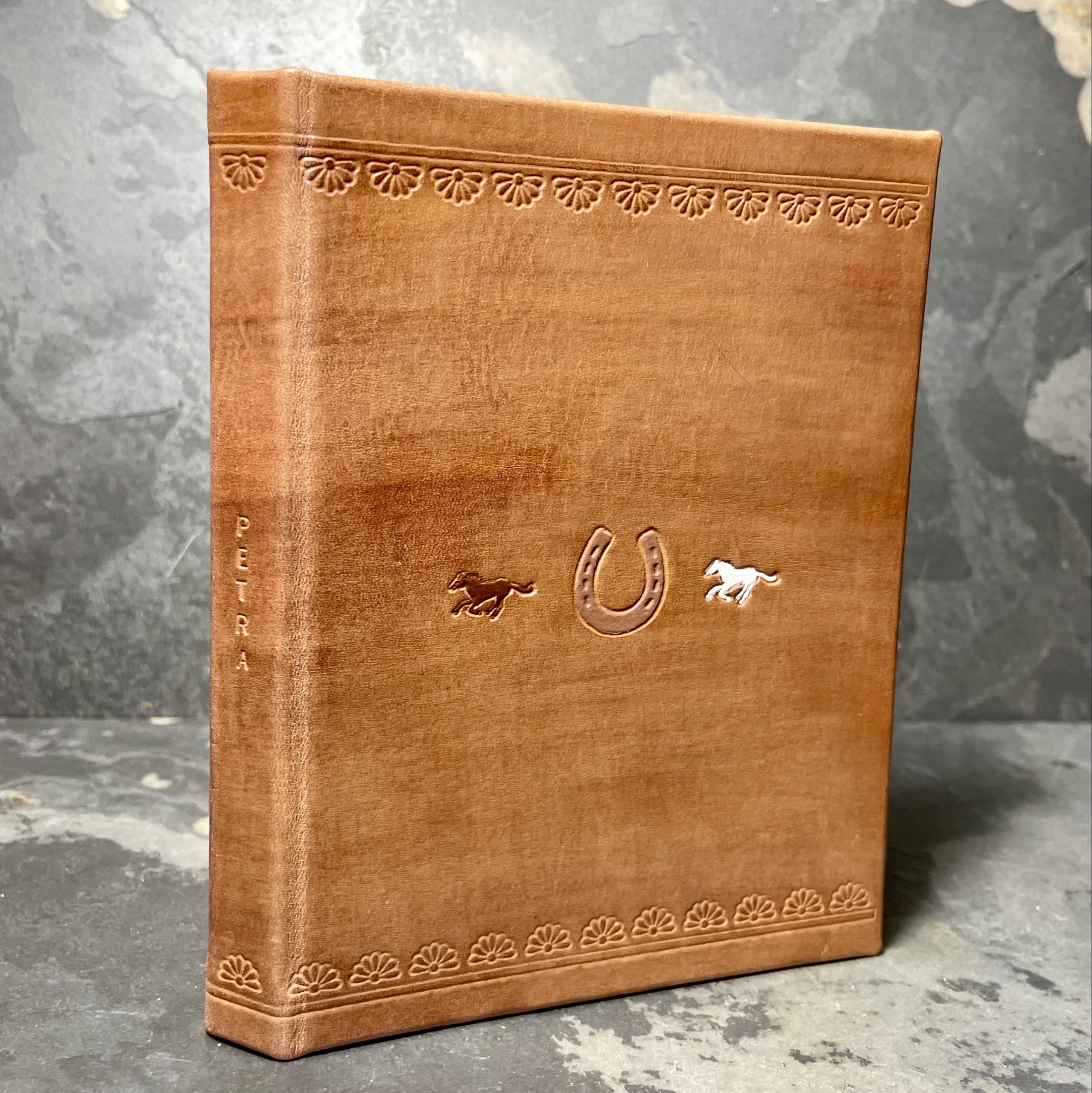 Echtleder-Einband mit personalisierter Prägung und Bemalung per Hand.