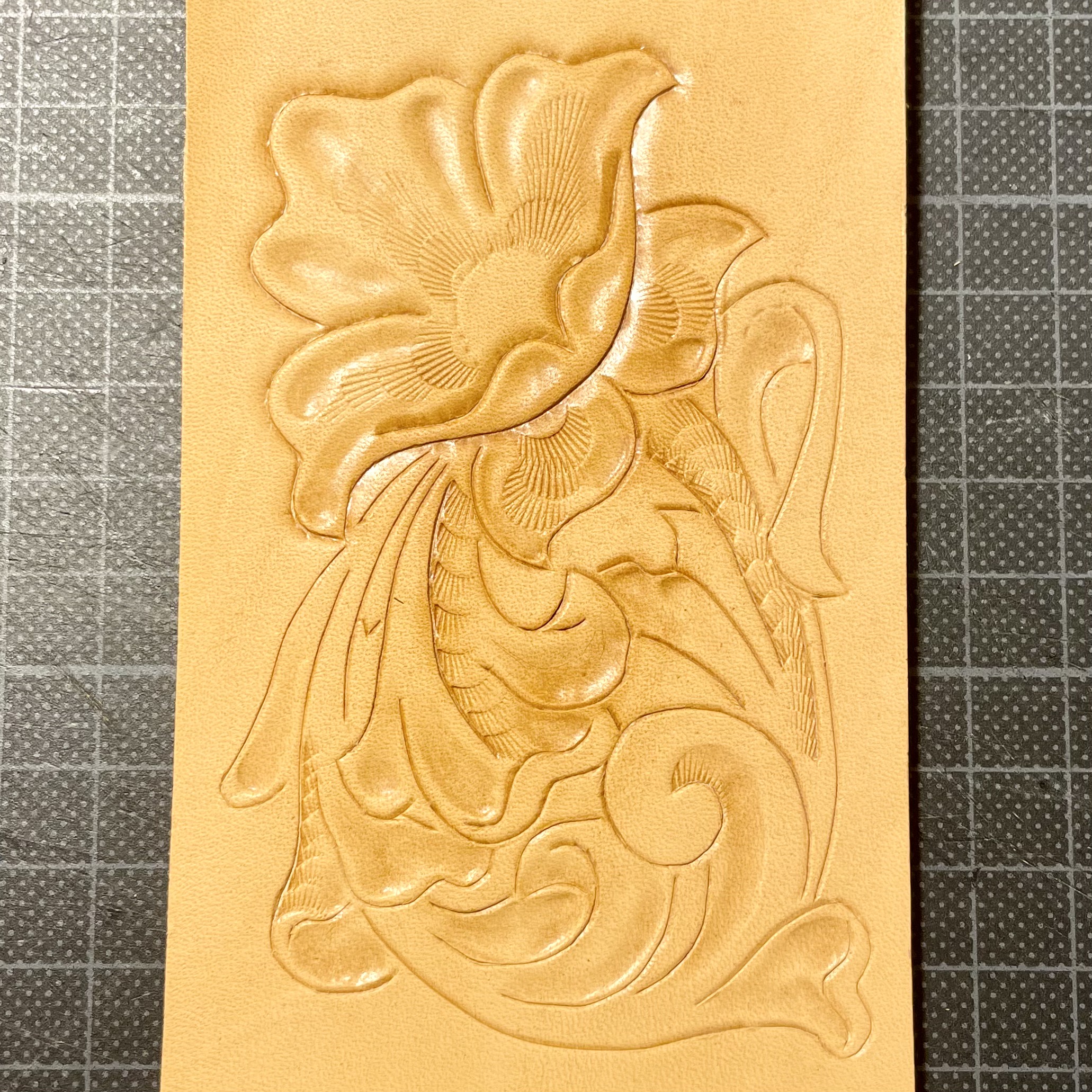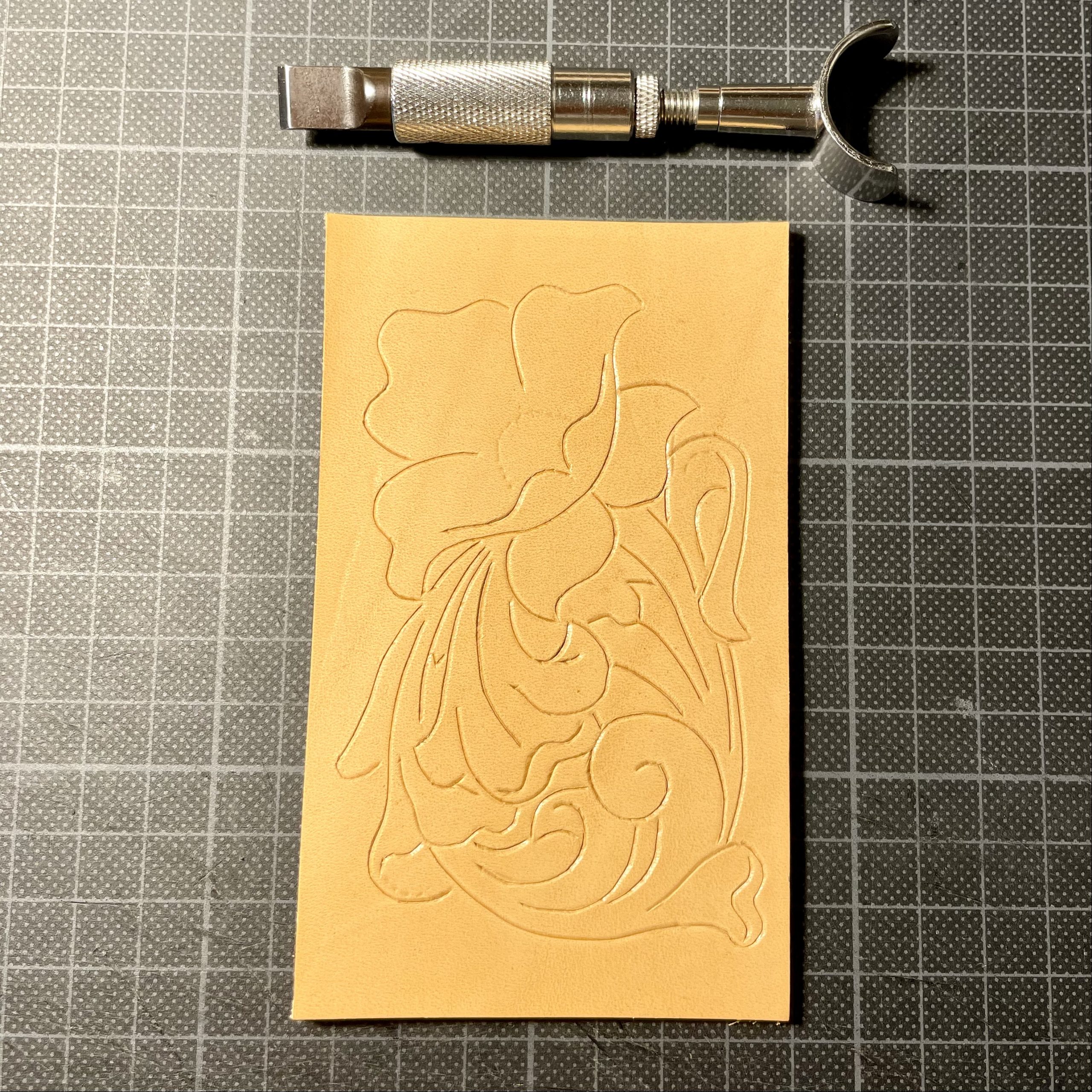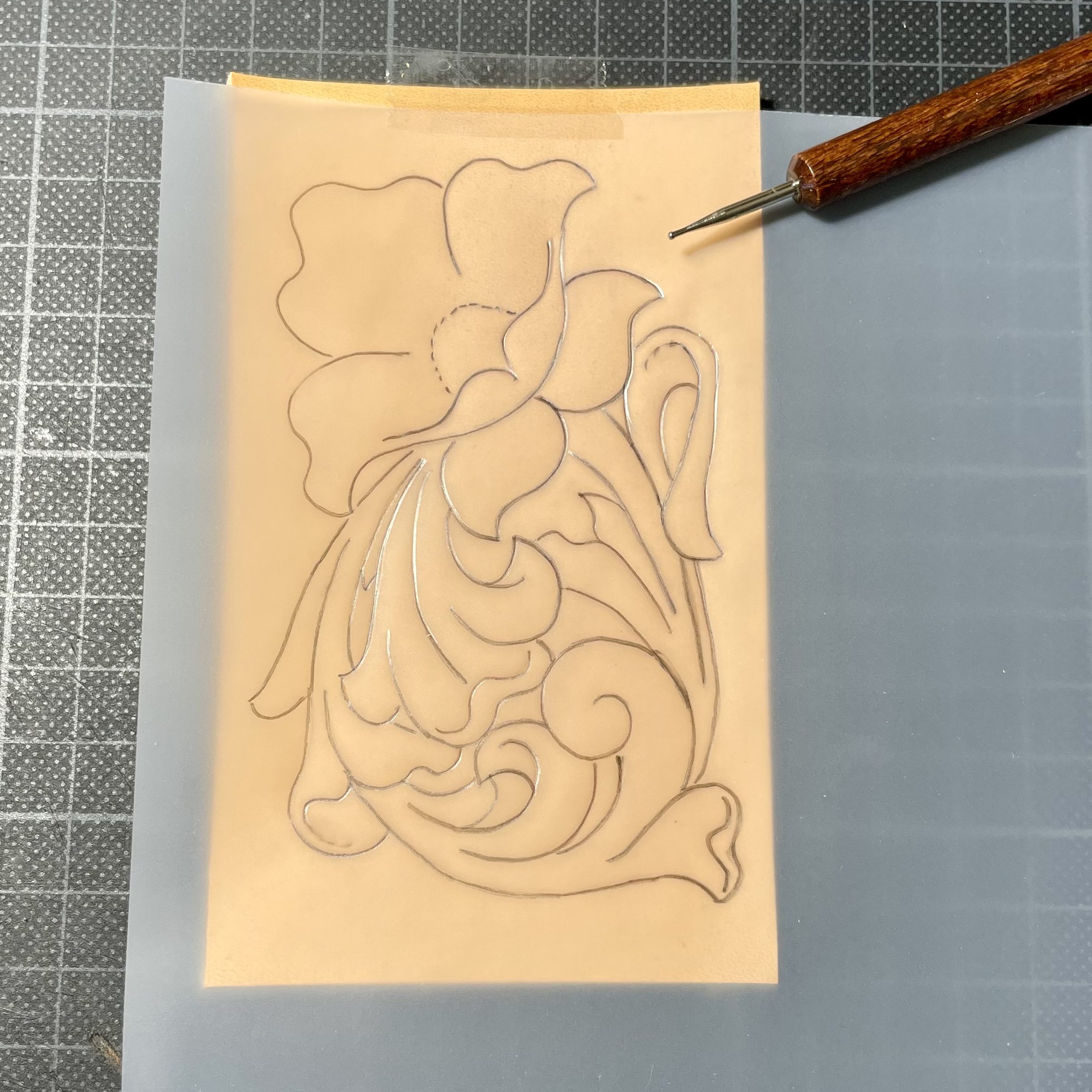 1) Übertragen eines Motivs auf das pflanzlich gegerbte Blankleder (handgezeichnete Vorlage von Jim Linnell).