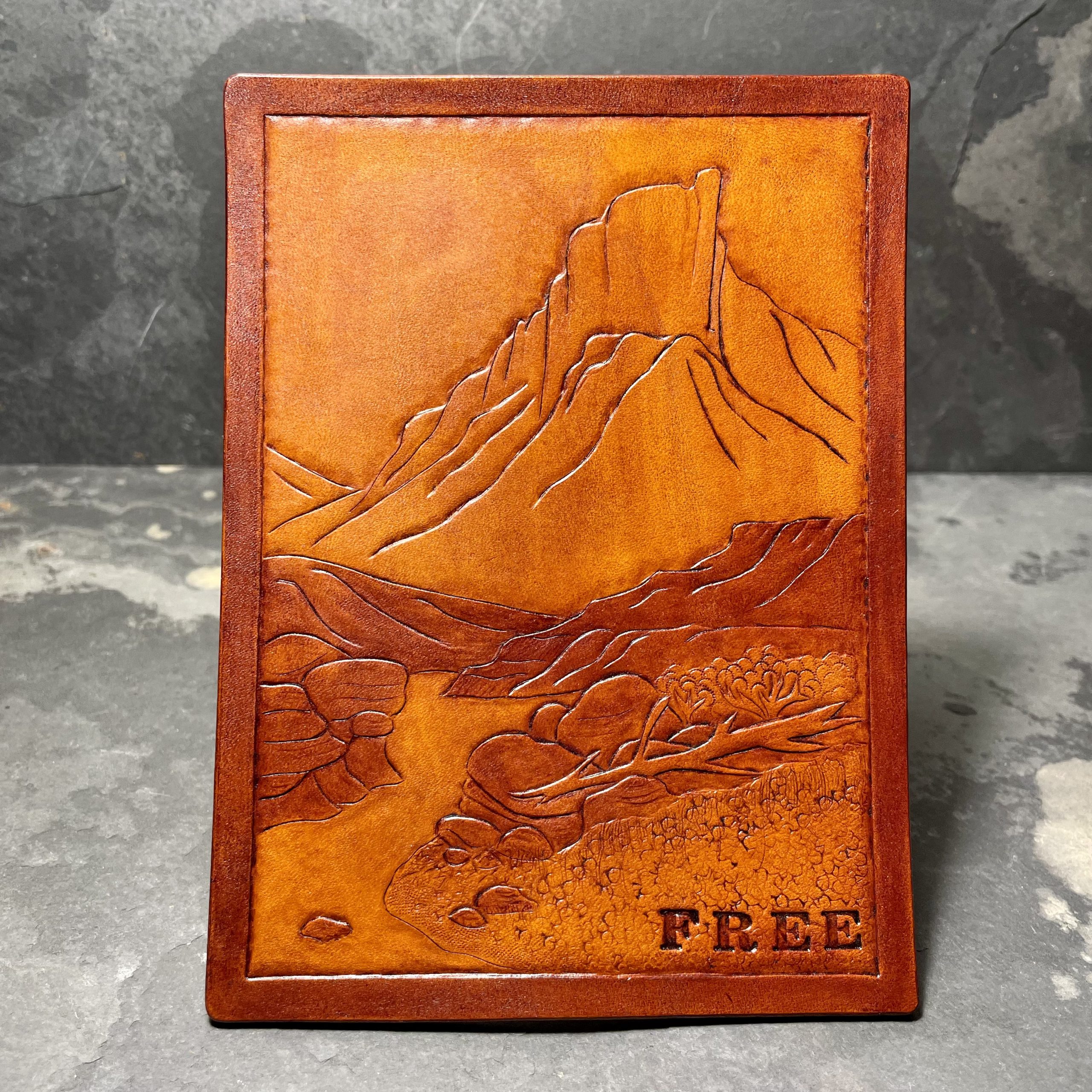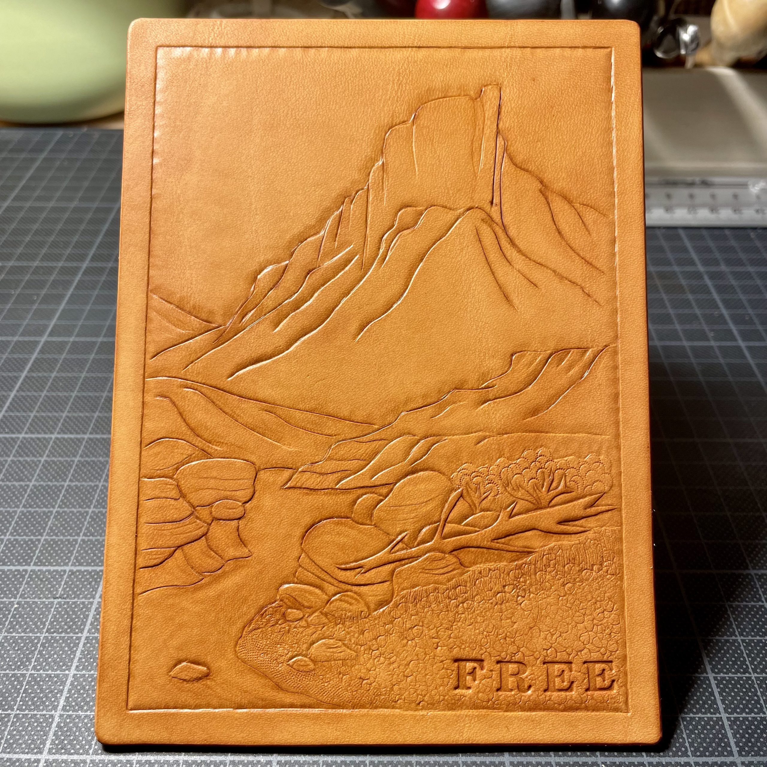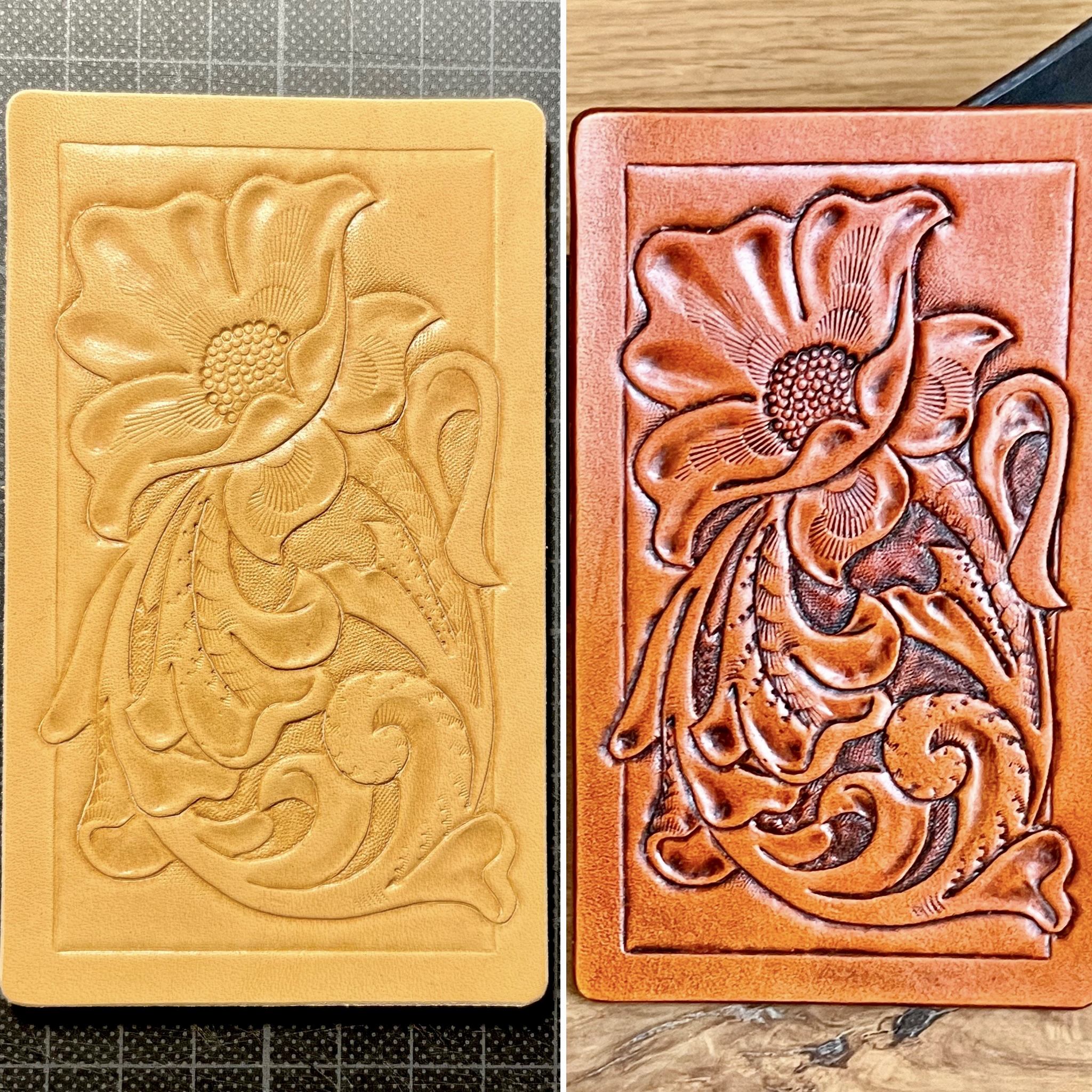 1) Übertragen eines Motivs auf das pflanzlich gegerbte Blankleder (handgezeichnete Vorlage von Jim Linnell).